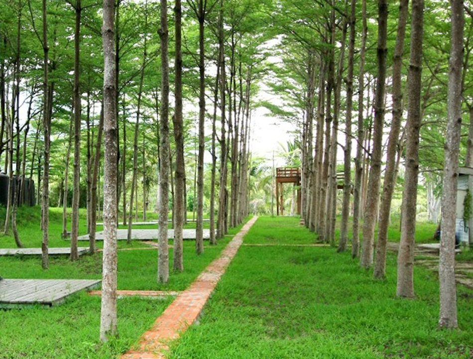 三五好友徜徉在園區廣大的小葉欖人樹林間,